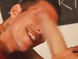 Ein muskulöser Kerl bearbeitet den Schwanz während er seine Zehen gelutscht bekommt